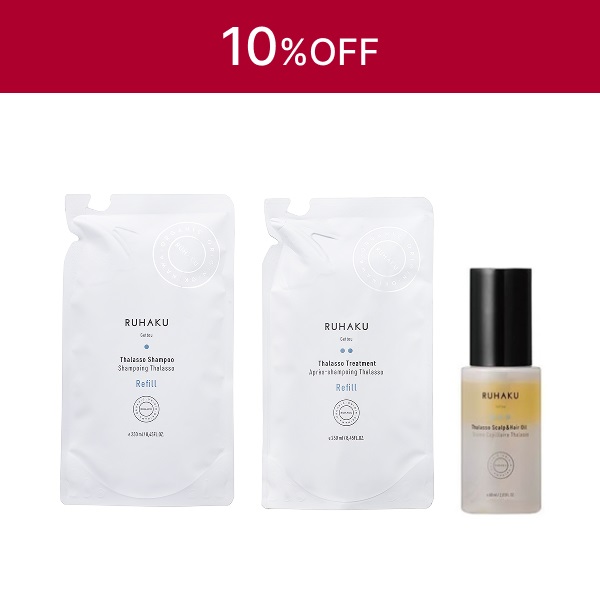 頭皮や毛髪の変化を実感いただけるよう、詰め替えシャンプー・詰め替えトリートメント・ヘアオイルの3点セット。