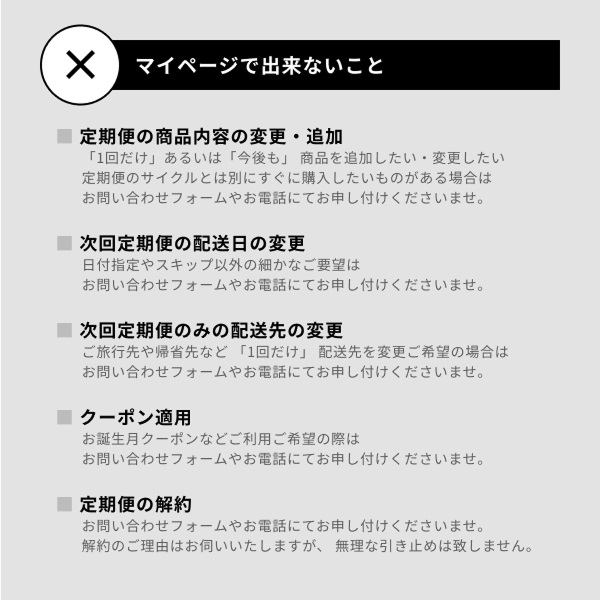 定期便お申込と同時に、定期便解約・定期便お受け取り前の定期便解約は承りかねます。定期便解約ご希望の方は、定期便お申込み商品をお受け取りになった後にその旨をご連絡ください。