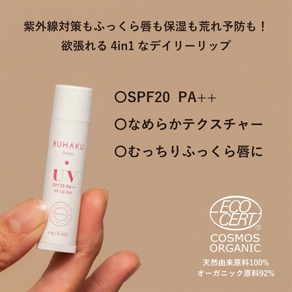 沖縄の自然の恩恵を受けているブランドとして、2016年7月にエシカルな日焼け止め「月桃UVボディヴェール」を発売し、国産オーガニックUVの品質を牽引してきた琉白。 唇の紫外線対策に着目し、日やけ予防効果のあるリップ「UVリップヴェール」を開発しました。 口紅を“一生で数kg食べてしまう”という俗説が広く語られるほど、唇から体内に入る可能性のあるリップ製品の安全性には、高い関心が寄せられておりますので、鉱物を摂取しなくてもすむよう、紫外線吸収剤・散乱剤不使用のUVリップにしました。 紫外線対策ができるだけでなく、スキンケア効果の高い月桃(荒れ予防)やむっちりふっくら唇に導く沖縄のタマヌ(整肌・保湿成分)。ショウガ(ハリ成分)も配合。 自身の血色で色づく健康的な唇で、すっぴんもリップメイクも存分に楽しんでいただけますように!