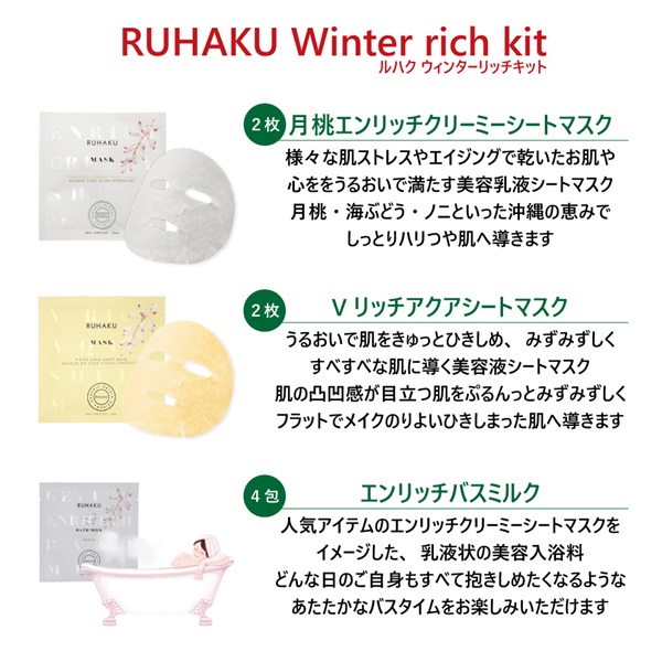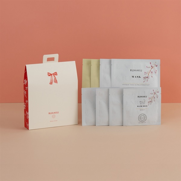 新製品のバスミルク(4包)と、シートマスク(2種4枚)が15%OFFになった数量限定のセット! 年末で忙しいときにもセルフケアが癒しとなり、自分を調える時間になるような想いが詰まったギフトです。 そのまま渡せるハンドル付きのボックスに入れてお届けします。
